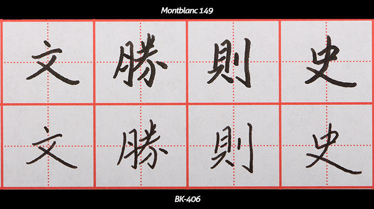 圖片看不到的是,BK-406相對於BK-402,沒有那麼順滑。但又不是日系的細鋼筆如白金Preppy的那種顆礫感,而是一種類似於橡皮滑過玻璃的阻尼感——沒有起伏,淡定的高冷感覺,但是依然廉價。