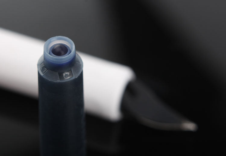 注意注意,BK406筆身自帶一個藍黑色墨囊:旋開筆身會看到一個空膠管,將其取走,再輕輕甩一下筆身,duang~~一根藍黑色墨囊出現了!是的,藍黑色~