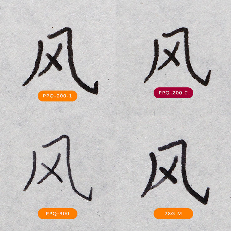 PPQ-200相對於PPQ-200-2,是一支更“肥膩”的筆,顯軟顯胖;而78GM則肥中帶滯,筆勢雖然有變化,但不好控制;PPQ-300根本不適合練字。