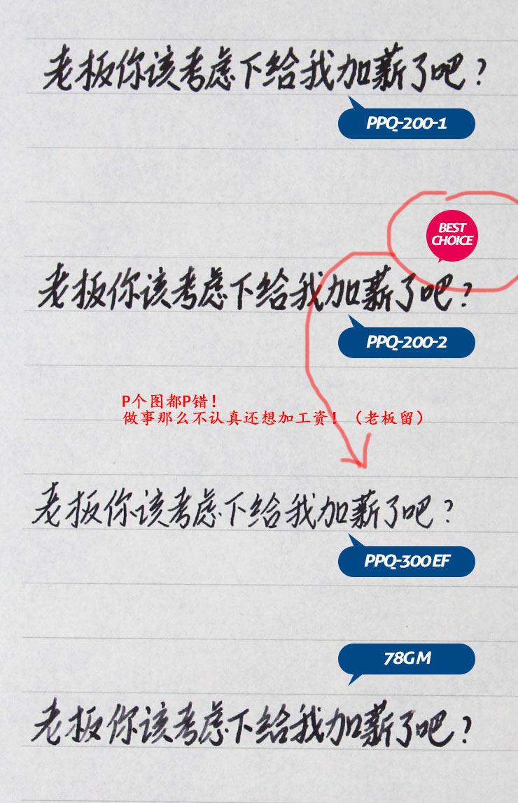 這是書寫在8毫米高線寬的不湮墨國產本上的效果,書寫小字的時候,EF尖的PPQ-300優勢明顯,但相信你也能夠看出來PPQ-200-2比PPQ-200筆劃更顯凌厲。