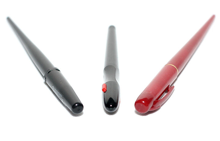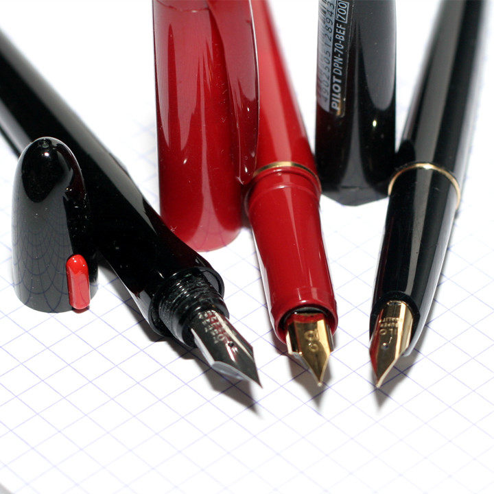 我們選擇了三支速寫鋼筆來做對比: 百樂FP-50R,百樂DPN-70,白金DPQ-700A,均為EF尖,均以墨囊測試,使用法國Rhodia 網格本做測試用紙。