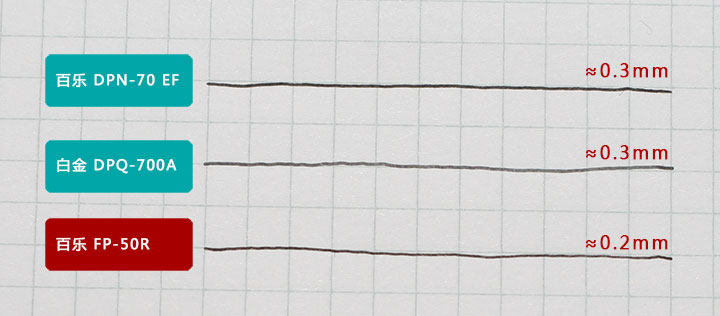 50R在3款之中是出水最細的,但線條穩定不斷墨,白金700A墨跡偏淡,百樂70EF與50R十分接近,但出水稍微更粗一點點