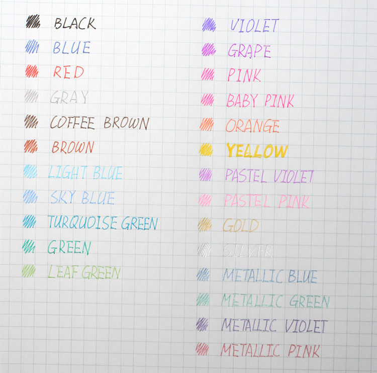 “Juice”的筆芯一共有36種顏色,加上2個透明和不透明的外殼,一共有72種搭配!另外還區分了0.38、0.5、0.7和1.0四個尺寸的筆芯,“Juice”是一個龐大的中性筆家族。